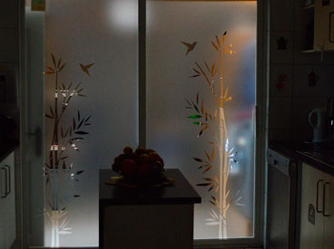 Empavonado ventanal cocina - logia. Diseño e Instalación interior cortada en figuras de bambú. Código Cb-06
