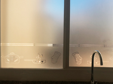 Empavonado ventana dormitorio. Diseño e Instalación interior cortada en figuras de tazas. Código Cb-04